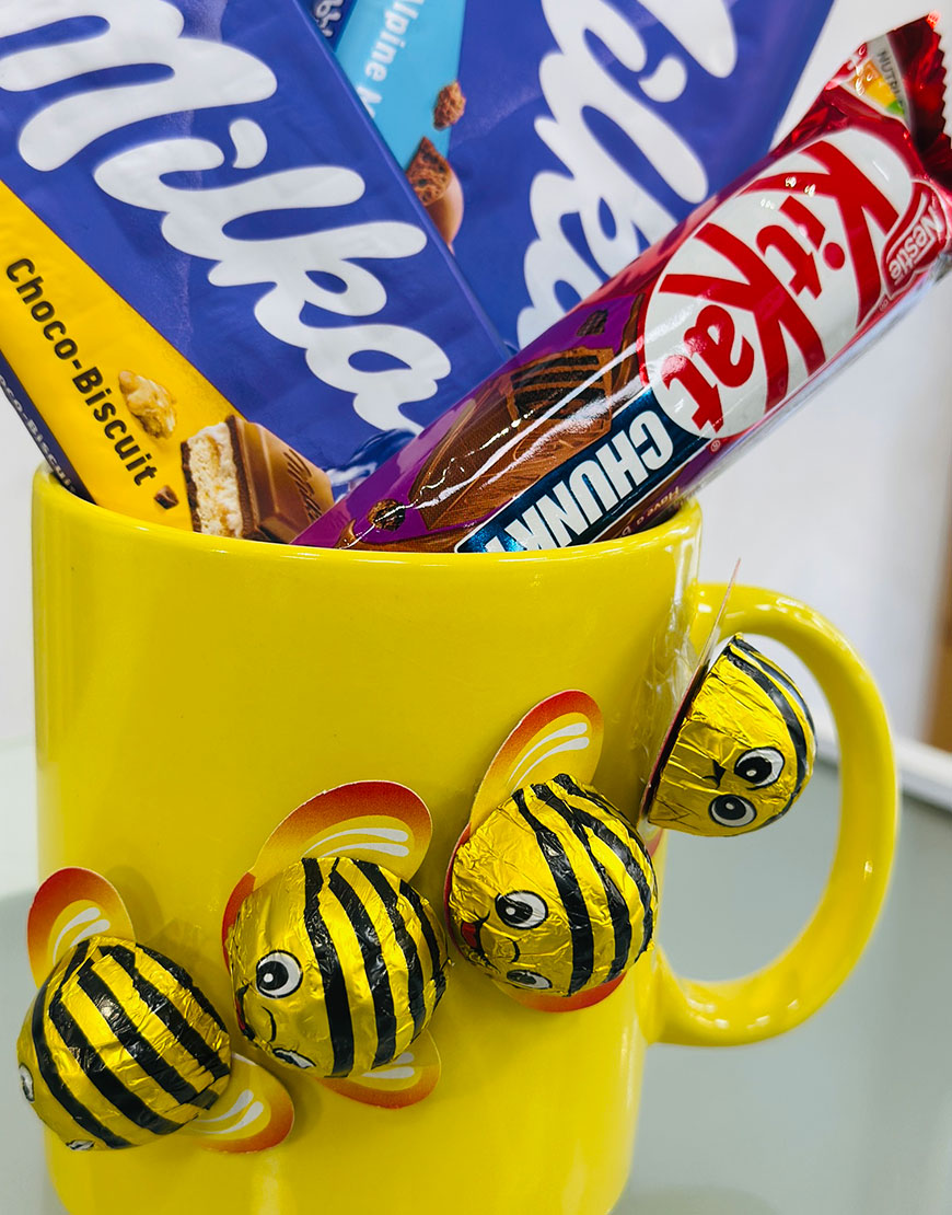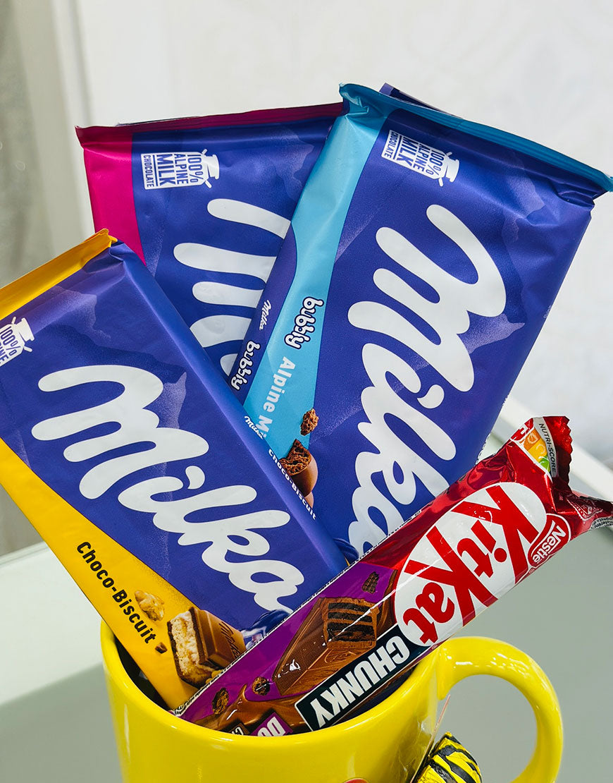 Precio unitario / porTaza de 500ml, Contiene: kitkat chunky de chocolate, 3 tabletas de milka, 4 mariquitas de chocolate