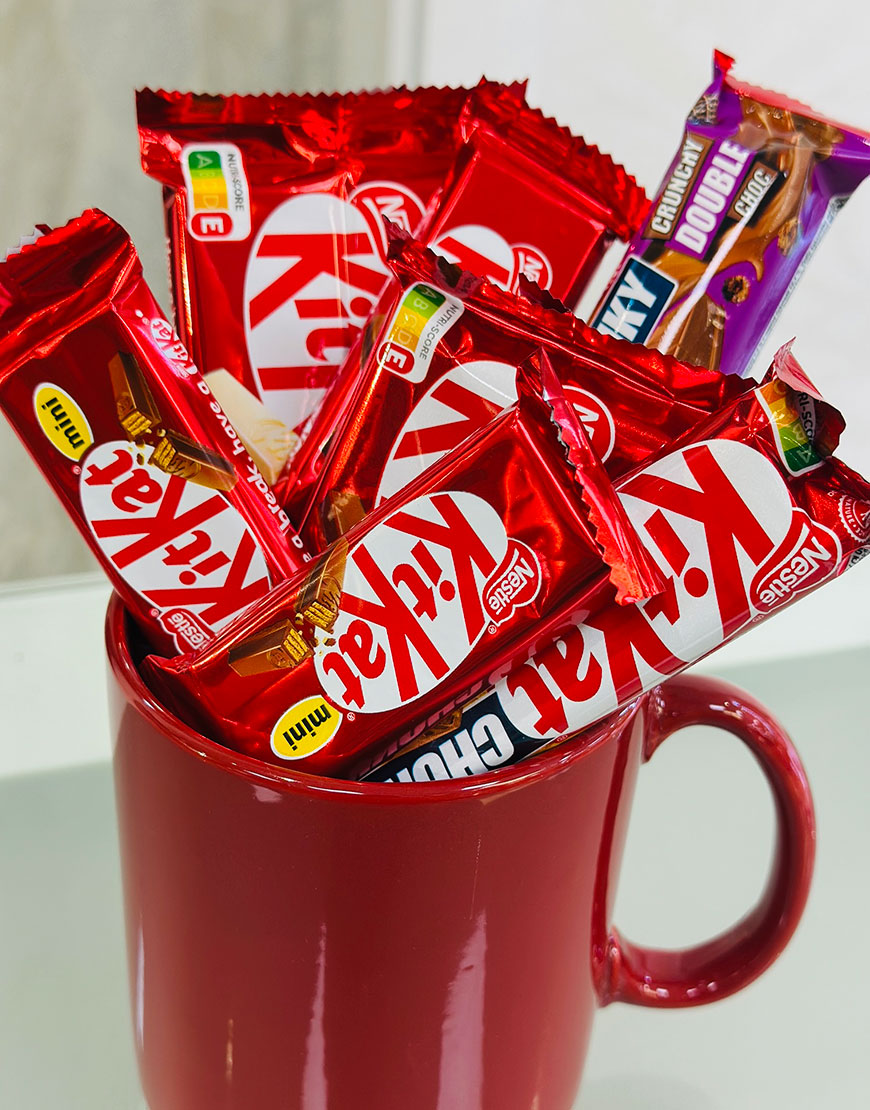 Precio unitario / porTaza de 500ml, Contiene: kitkat de chocolate blanco, kitkat de chocolate negro, 3 mini kitkat, kitkat chunky de doble chocolate y otro de avellana