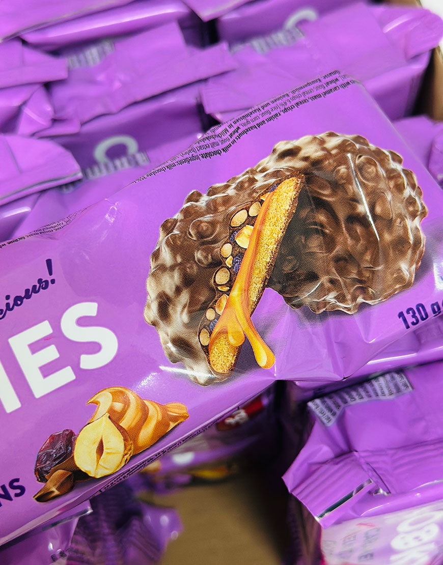 Galletas con avellanas,nueces,pasas, recubiertas de chocolate con leche 130 gr