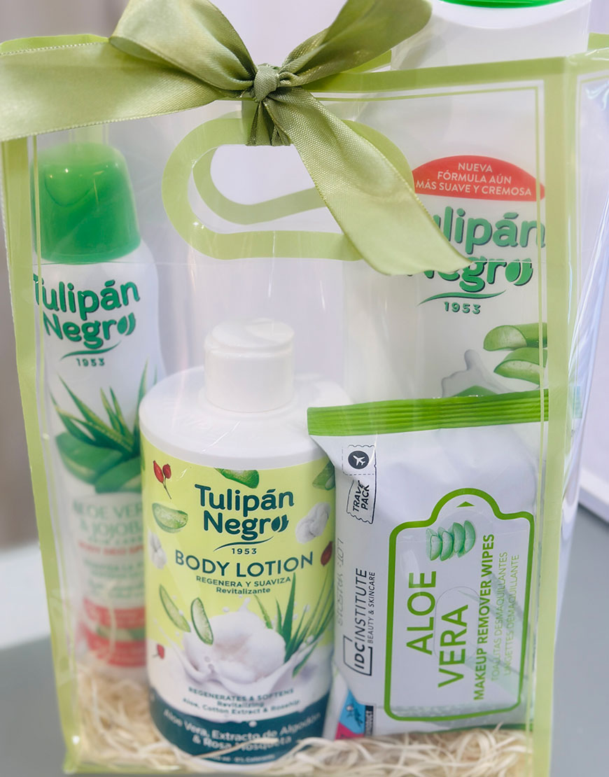 Precio unitario / porContiene gel de baño, desodorante, locion corporal y toallitas desmaquillantes, todo de Aloe Vera