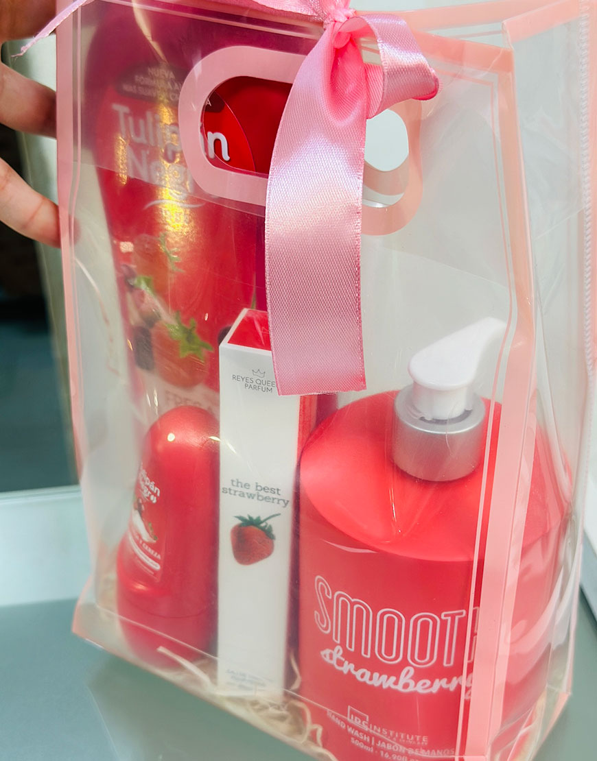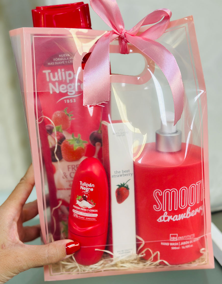 Precio unitario / porContiene gel de baño de fresa y cereza, jabon de manos de fresa, colonia de fresa y desodorante de fresa y cereza