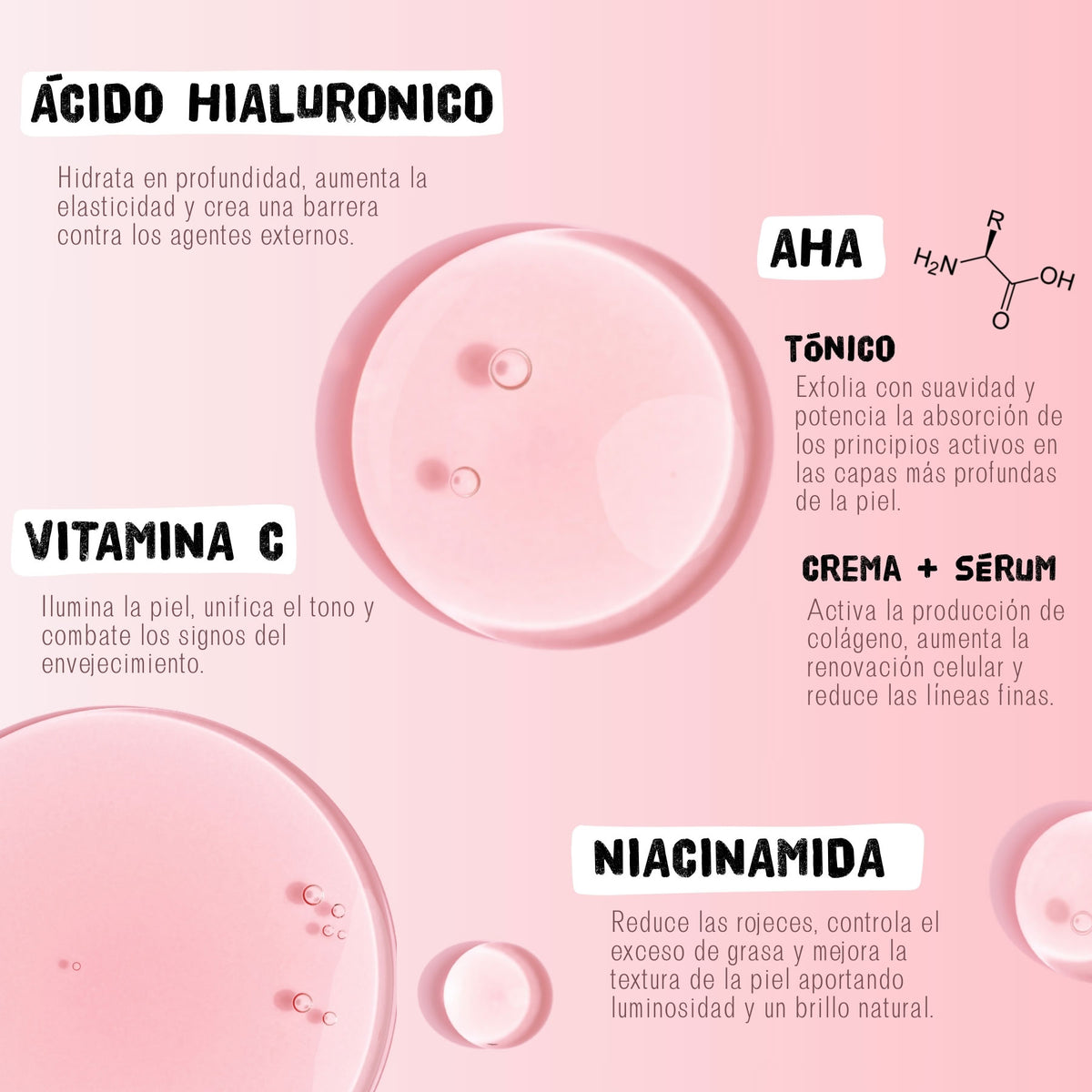 Exfolia con suavidad, mejora la textura y prepara la piel para absorber el resto de activos. Formulado con Niacinamida, Vitamina C y Ácido Hialurónico, ayuda a cerrar poros y aporta una sensación inmediata de frescor.