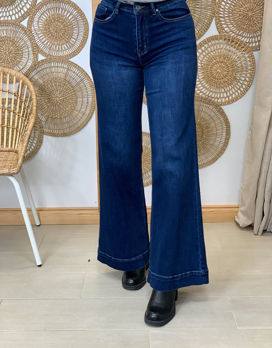 Vaquero wide leg con bolsillos delanteros y traseros, bajo desflecado.