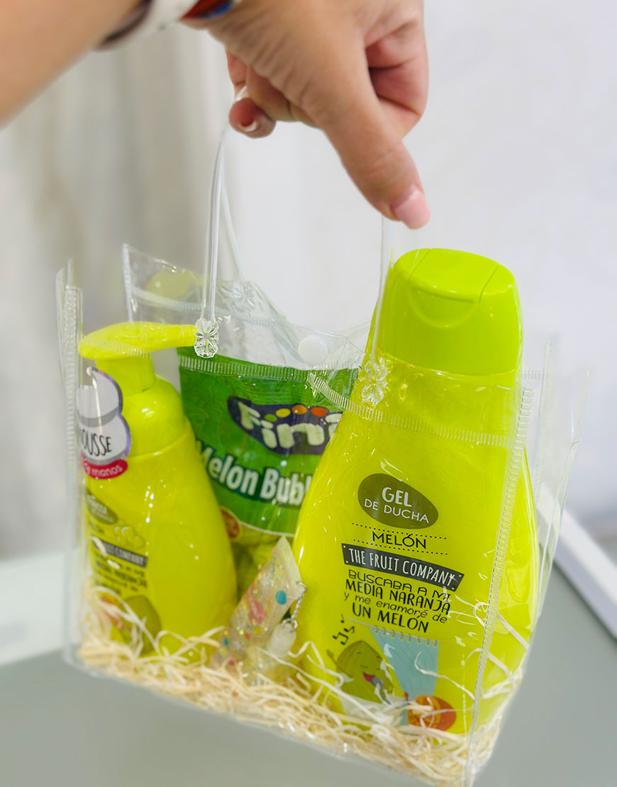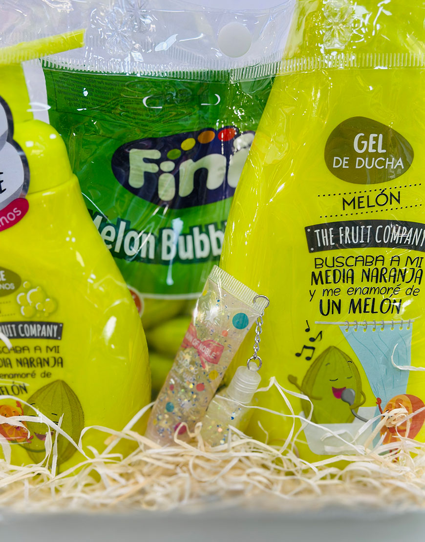 Precio unitario / porContiene gel de melon, mousse de manos de melon, bolsita de melones de chicle y brillito labial de brillo con llavero.
