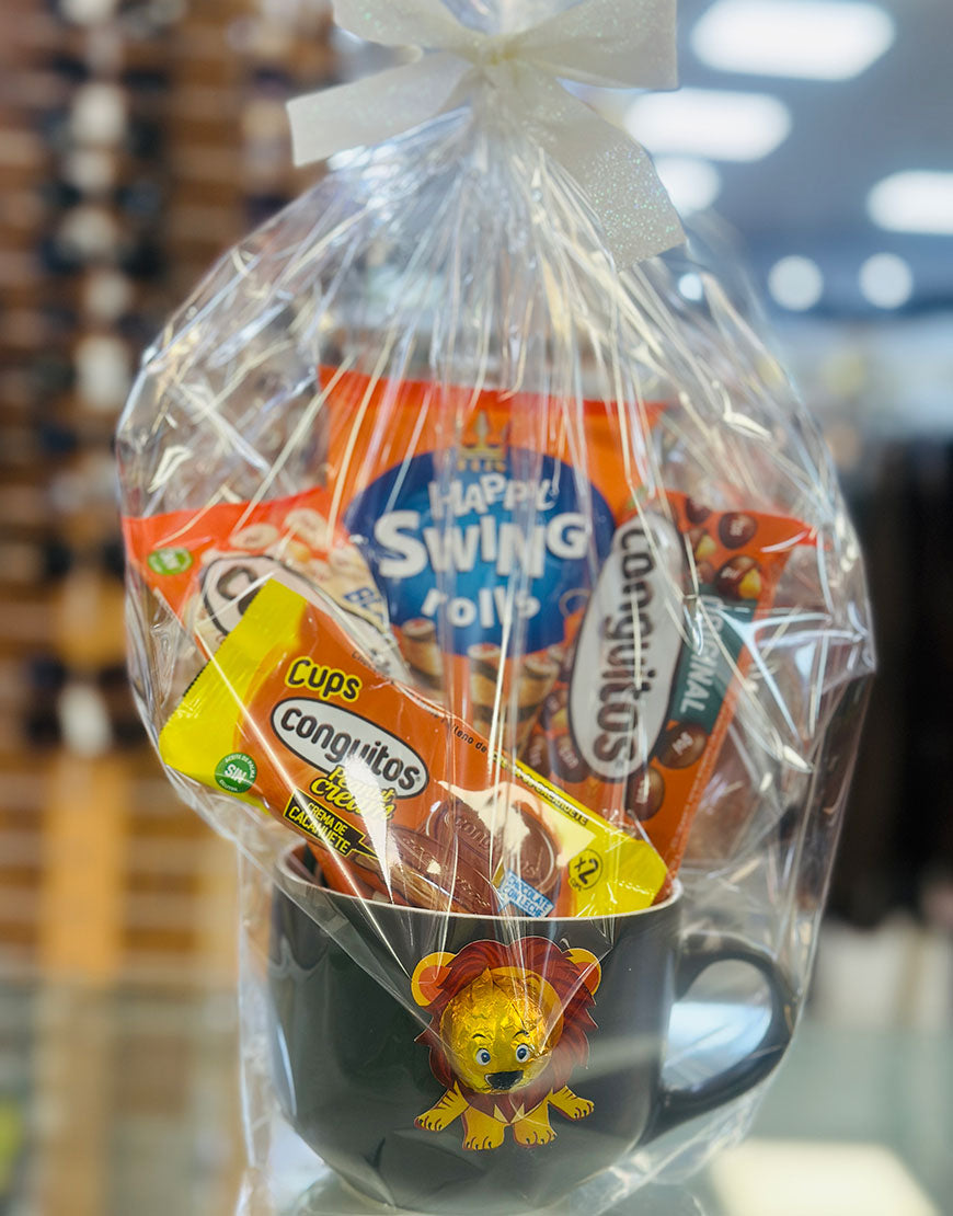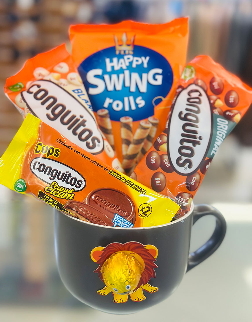 Unit price / perContiene: taza jumbo 450ml, rollos barquillos caramelo, bolsa de conguitos blancos y otra de negros, cups conguitos, animales de chocolate, todo envuelto en papel transparente