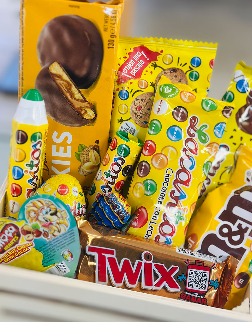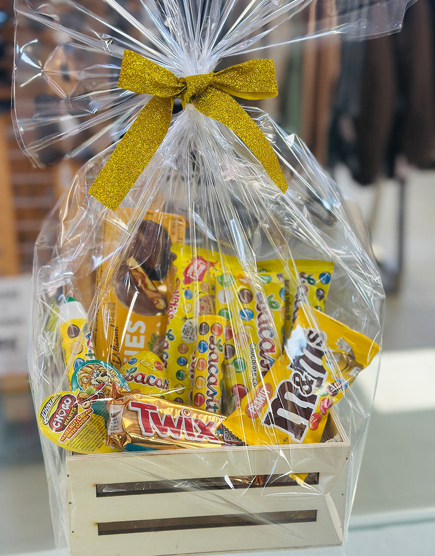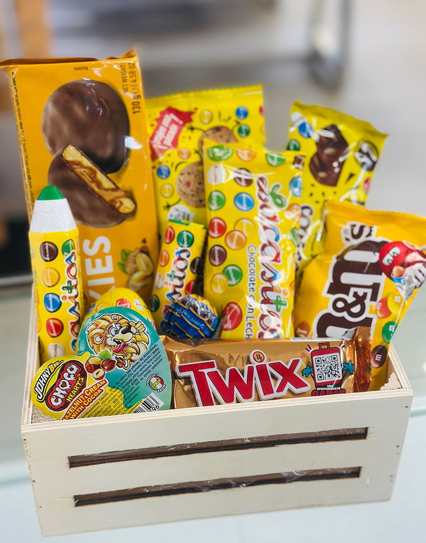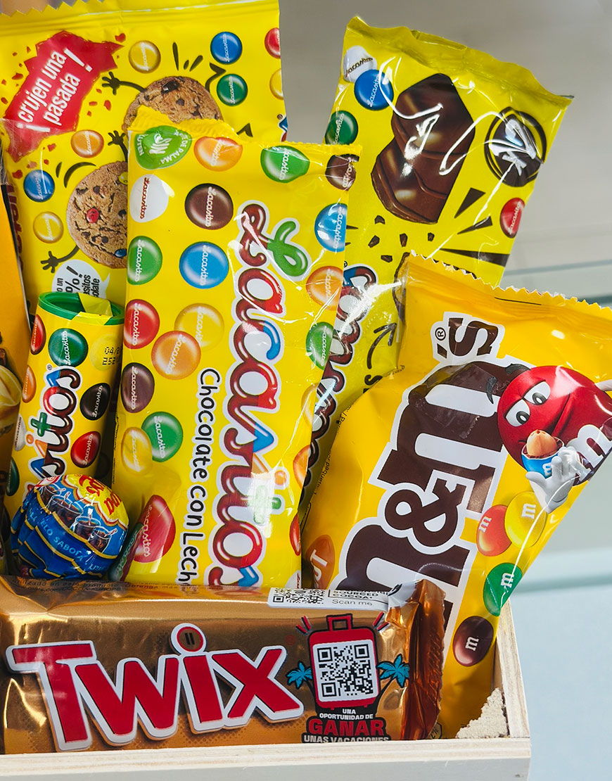 Unit price / perContiene: choco corazon, cookies crema de cacahuete, bolsa de lacasitos grande, 2 baritas de lacasitos, galletas de lacasitos, twix, lapiz de lacasitos, tubo de lacasitos y chupachups, huevo de lacasitos, bolsita m&m, caja de madera, todo envuelto en papel transparente