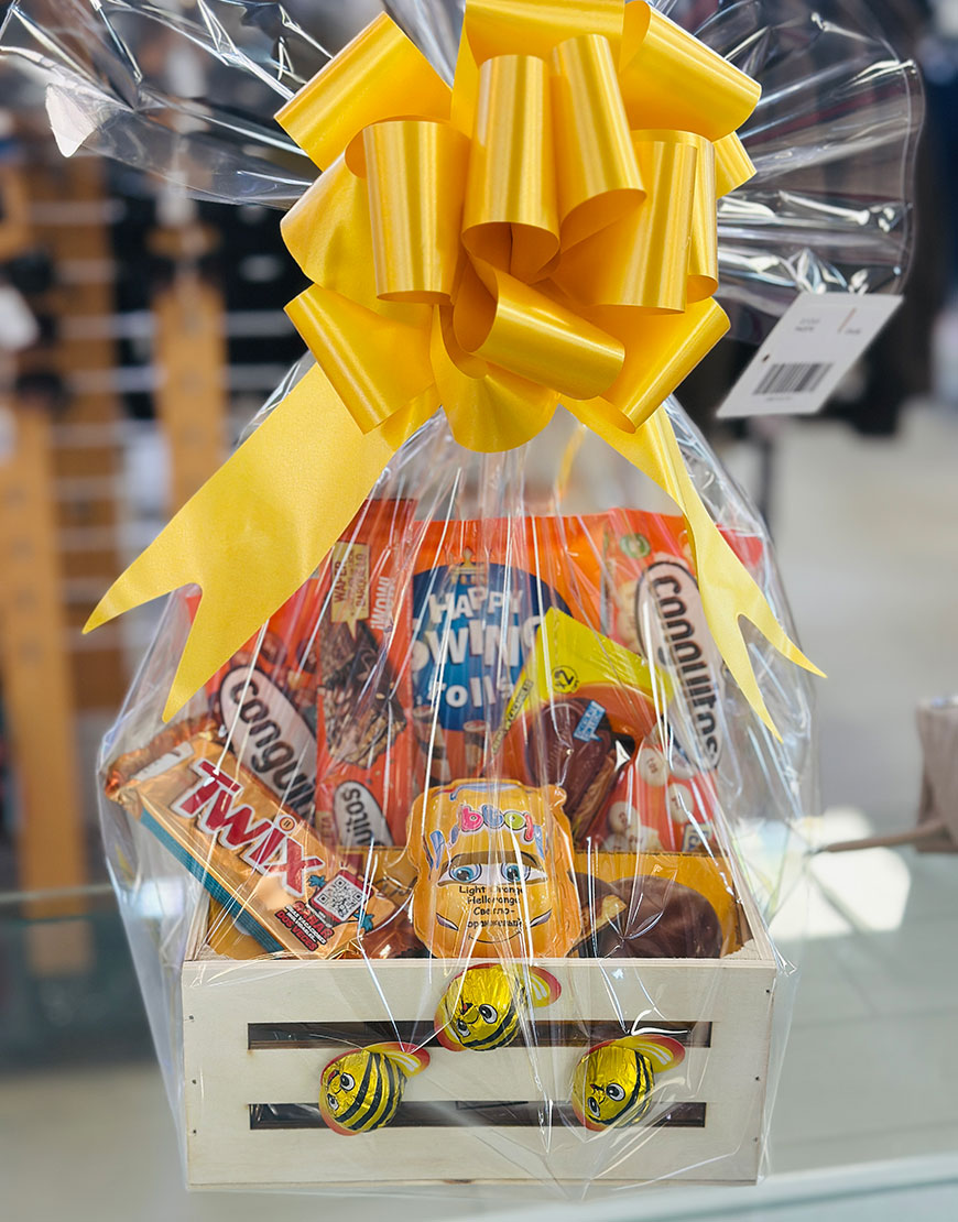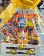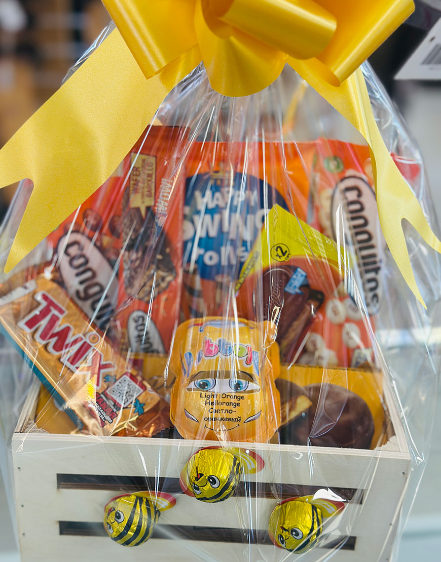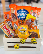 Unit price / perContiene: cookis crema de cacahuete, bolsa de conguitos blancos y otra de chocolate con leche, wafer de conguitos, cups conguitos, twix, choche de chocolate con sorpresa, abejas de chocolate 2, roll rellenos de caramelo, caja de madera, todo envuelto en papel transparente