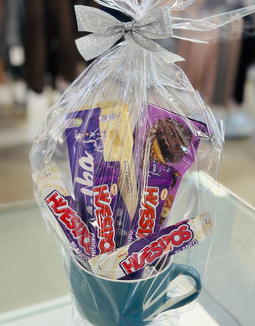 Unit price / perContiene: taza jumbo 450ml, cookies caramelo, milka choco blanco, 4 huesitos de chocolate negro y blanco,, todo envuelto en papel transparente