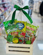 Unit price / perContiene bolsita de ojos rellenos, bolsita de chuches pica , bolsita de sandias, rollos de barquillos pistacho, gelatina fruit , roll sandia, 4x palotes sandia, piruleta cuche, chuche platano, chuche sandia, chuche manzana, caja de madera, todo envuelto en papel transparente