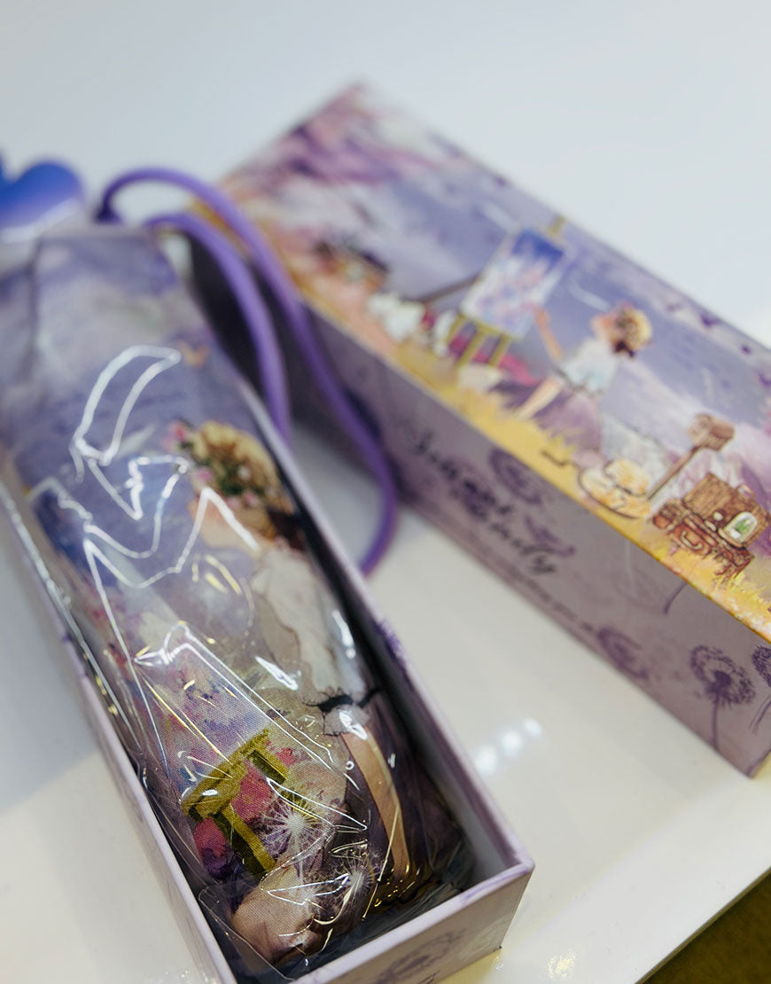 paraguas en cajita de la colección sweet candy, tiene su funda y el mango de corazon, tambien trae una cuerda para llevarlo a colgado a bandolera