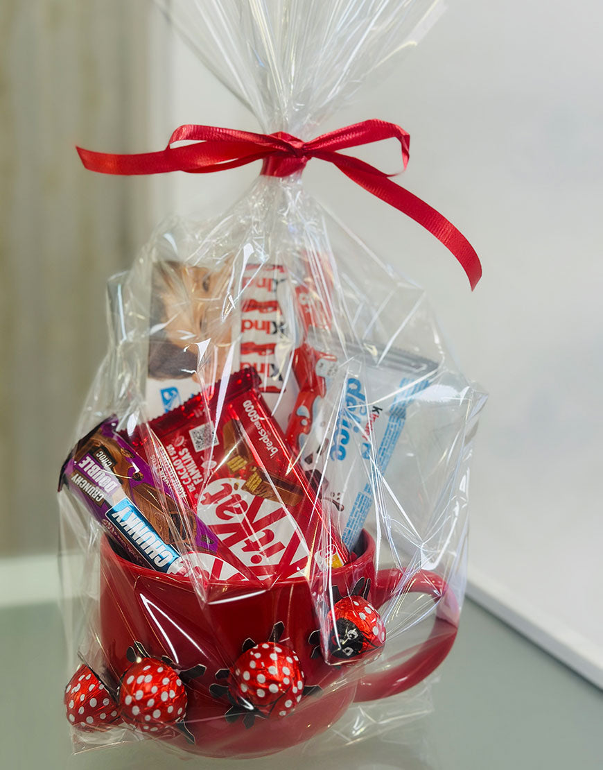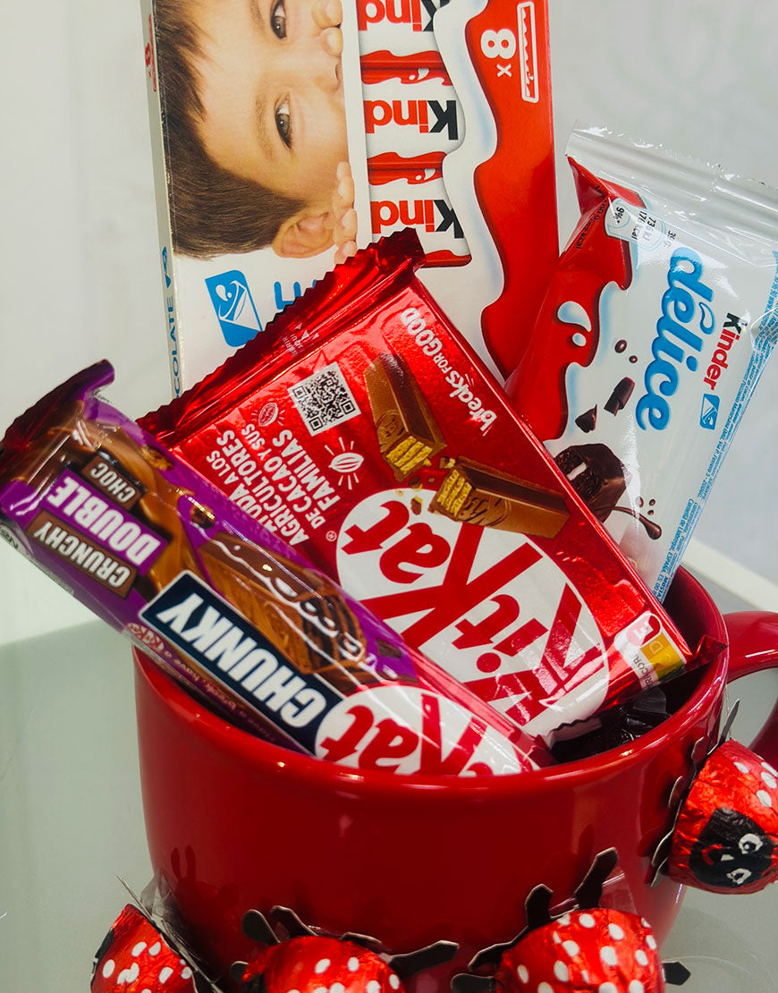 Precio unitario / porTaza de 500ml, Contiene: kitkat clasico, kitkat doble choco chunky, kinder delice, kinder 8 barritas , 4 mariquitas de chocolate